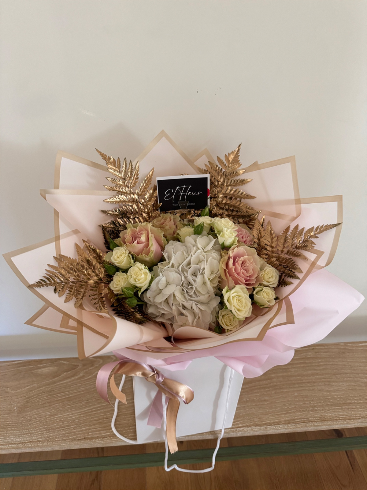 A handpicked bouquet designed with the freshest blooms of the day, finished with our signature gold touch.