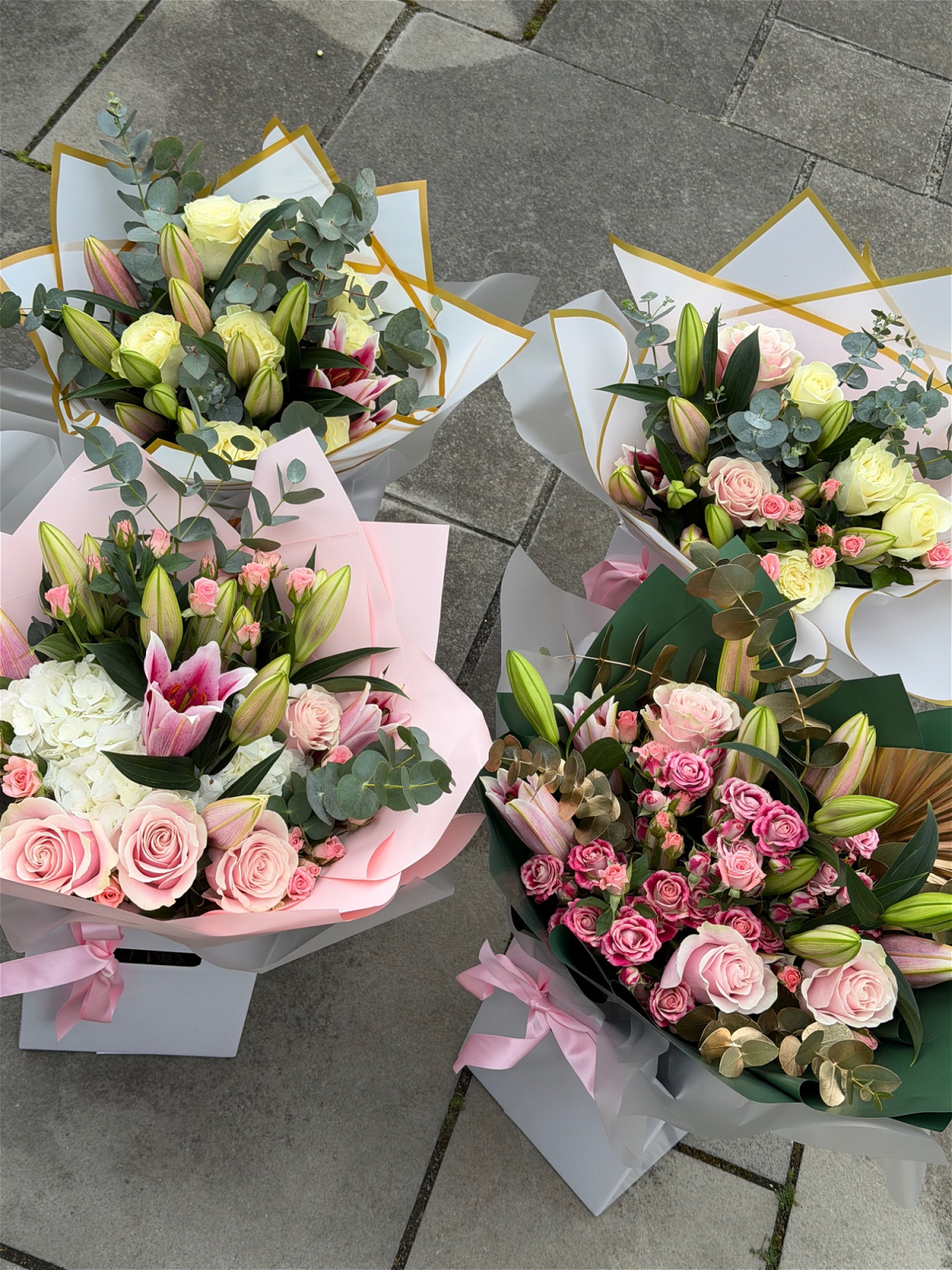 A gorgeous mix of Lillys, roses and spray roses with green foliage or gold foliage depending on your preference.